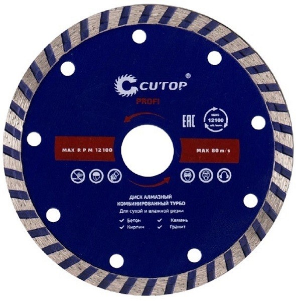 Диск алмазный Cutop Profi 61-23030 является довольно универсальным и предназначен для резки бетона, кирпича, гранита, мрамора, и камня. Используется совместно с электроинструментом. Усиленная конструкция.