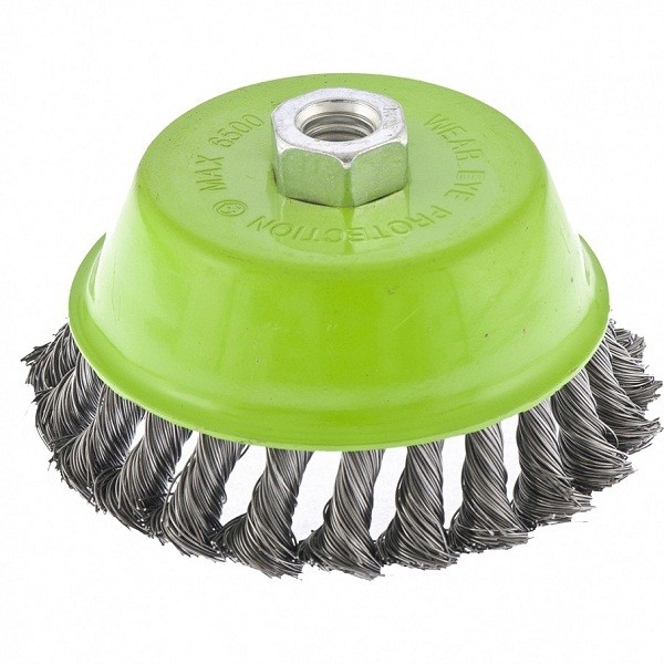 Щетка Сибртех применяется для грубой очистки поверхностей от ржавчины, грязи, удаления лакокрасочных покрытий, получения заданной шероховатости. Форма чашка обеспечивает хорошую площадь прилегания к поверхности и предназначена для обработки больших плоскостей.