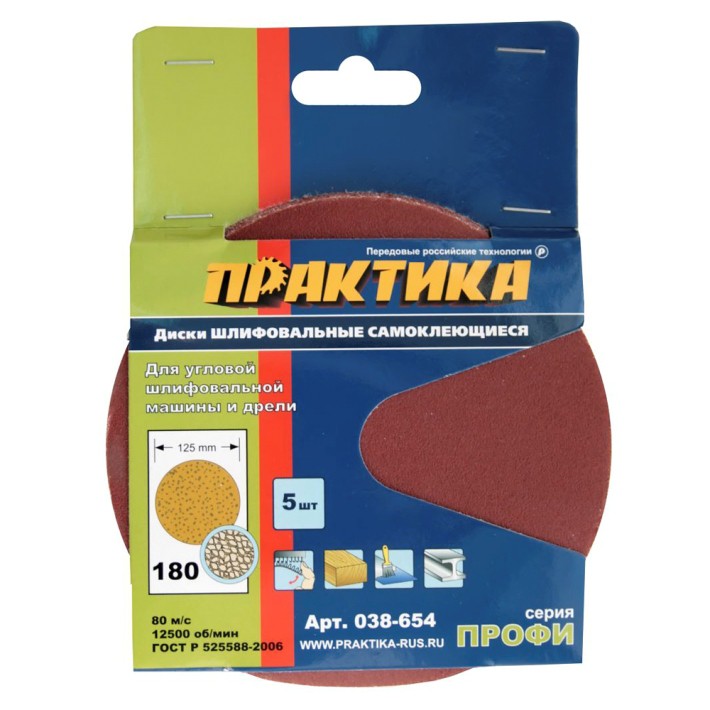 Круг шлифовальный Практика 038-654 предназначен для использования в эксцентриковых шлифмашинах. Применяется для финишной обработки поверхности. Подходит для мягкого и твердого дерева, фанеры, металла, лакокрасочных покрытий. Диаметр круга составляет 125 мм, зернистость - P180. Абразивный слой выполнен из электрокорунда. Изделие надежно крепится на опору шлифмашинки за счет наличия на нем специальной липучки.