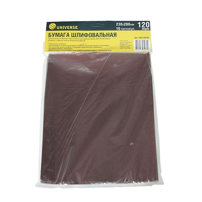 Шлифовальная бумага Universe USL150120 предназначена для шлифования твердых и мягких пород древесины, фанеры, ДСП, металла и других материалов, а также для зачистки лакокрасочных покрытий. Степень зернистости Р-120 позволяет произвести первичную зачистку и разравнивание поверхности.