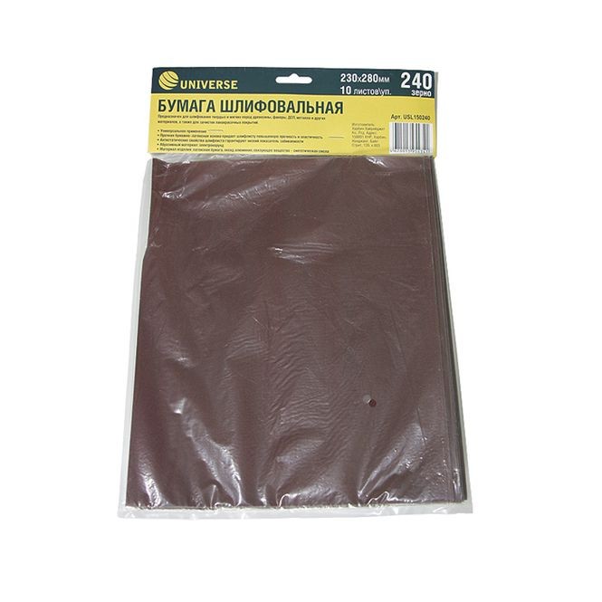 Шлифовальная бумага Universe USL150240 предназначена для шлифования твердых и мягких пород древесины, фанеры, ДСП, металла и других материалов, а также для зачистки лакокрасочных покрытий. Степень зернистости Р-240 позволяет произвести финальную зачистку и шлифовку поверхности.