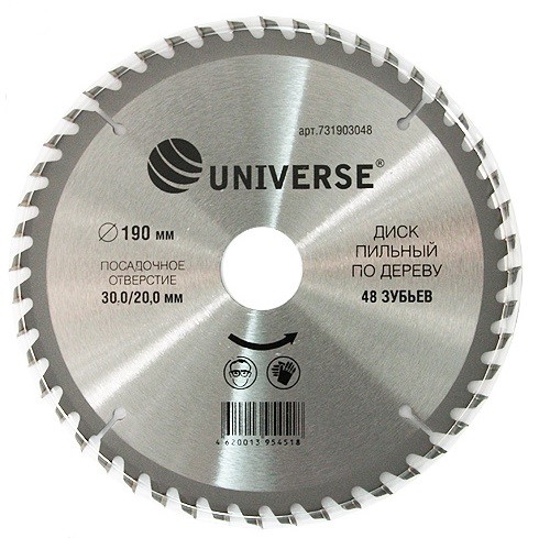 Пильный диск Universe 190х30 мм 48 зубов предназначен для распиливания древесины, многослойной фанеры, ламинированных ДСП, ламината, МДФ. Применяется при совместном использовании с ручными дисковыми пилами и циркулярными станками.