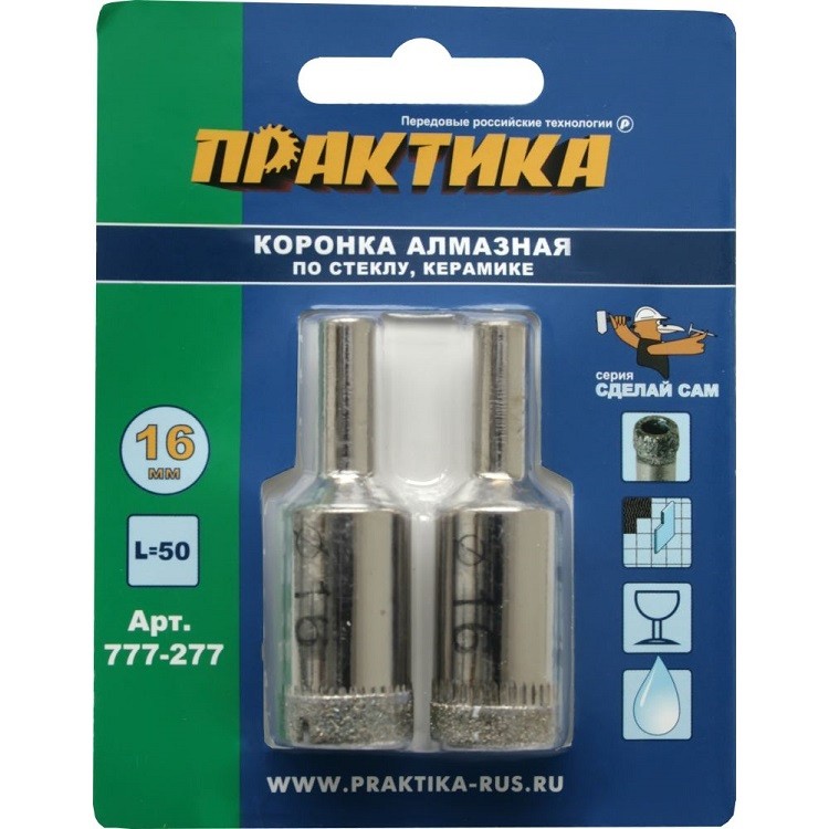 Алмазная коронка Практика Сделай сам 777-277 предназначена для сверления отверстий в стекле и керамике. Ограниченно подходит для сверления керамогранита. При этом работа производится с минимальными временными затратами и максимальной точностью. Мелкое зерно алмаза обеспечивает быстрое сверление и чистоту кромок отверстия.
