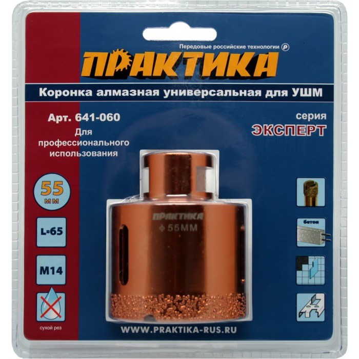 Коронка алмазная Практика 641-060 предназначена для использования в угловых шлифовальных машинах. Применяется для сверления керамогранита, гранита, напольной плитки высокой твёрдости, натурального камня, керамики, бетона, кирпича. Также идеально подходит для сверления материалов неоднородного состава и ограниченно подходит для сверления листового металла. При этом работа производится с минимальными временными затратами и максимальной точностью.