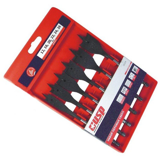 Набор перовых сверл USP 36205 относится к профессиональной серии. Они предназначены для сверления твердого дерева, ПВХ, алюминия. Центральная вершина позволяет начать сверление в точно размеченном месте. С помощью перовых сверл достигается точная обработка отверстий за минимальное время и уменьшается возможность деформации заготовки при сверлении.