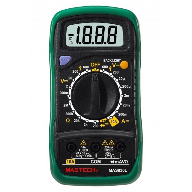 Цифровой мультиметр Mastech MAS830L производит измерения силы постоянного и переменного тока, величины постоянного и переменного напряжения, сопротивления, температуры окружающей среды и коэффициент усиления биполярных транзисторов (h21).