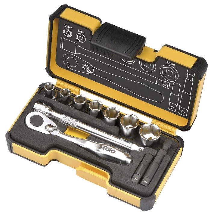 Felo5771106 - набор головок с мини трещоткой. Используется при проведении слесарных, ремонтных и монтажных работ. Набор поставляется в кейсе, обеспечивающем удобное хранение и транспортировку.