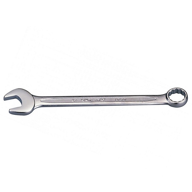 Комбинированный ключ King Tony сочетает в себе накидной и рожковый гаечные ключи. Первый эффективен при отворачивании тугих крепежей, второй лучше подходит для работы в труднодостпуных местах. Рожковый вид ключа имеет U-образную форму и охватывает деталь с двух или трёх сторон. Другая сторона ключа – накидная. Благодаря строению в кольце, в момент приложения усилия распределяет нагрузку равномерно, что снижает риск повредить грань угла.