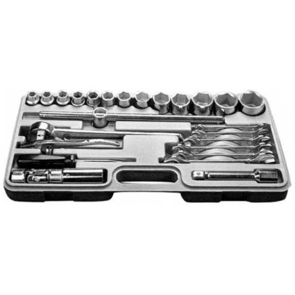 | Комплектация | Удлинитель / Вороток-рычаг / Вороток трещеточный / Переходник шарнирный / Головка свечная / Пассатижи переставные / Отвертка комбинированная / 6 ключей рожковых / 13 головок шестигранных 1/2" | |
