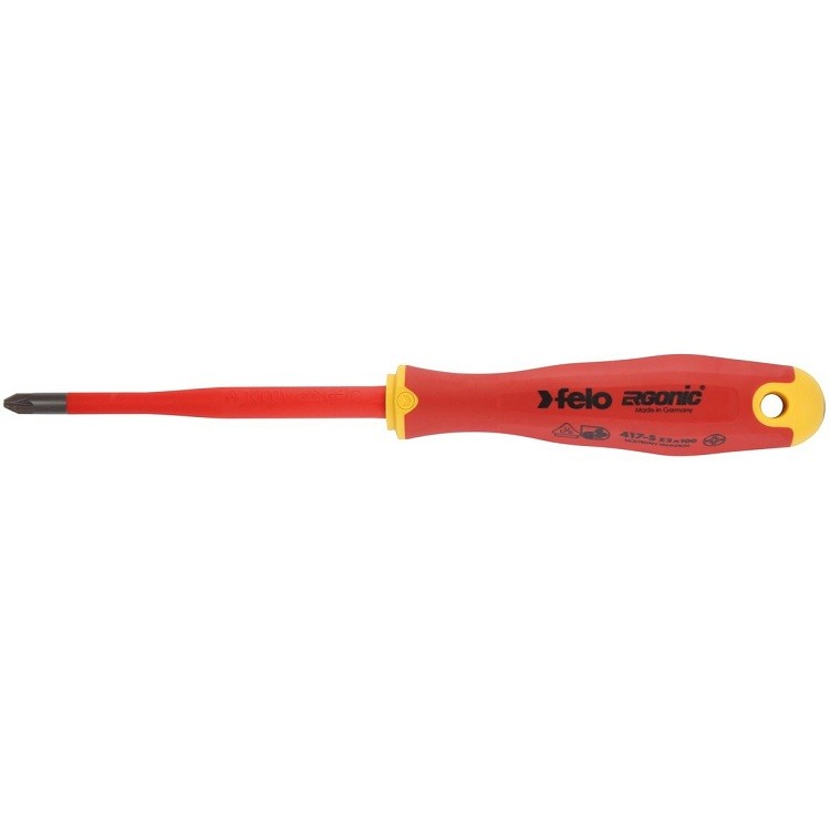 Диэлектрическая крестовая отвертка Felo Ergonic +/- E-Slim Z1X80 мм предназначена для электротехнических работ с резьбовыми соединениями, имеющими тип шлица PlusMinus PZ1. Стержень инструмента выполнен из хром-молибден-ванадиевой стали, что обеспечивает увеличенный ресурс работы и прочность. Серия Slim с утончённым лезвием даёт возможность работать в суженых местах.