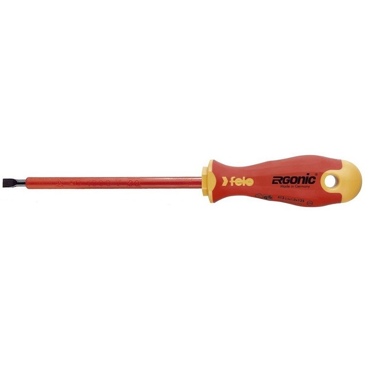 Диэлектрическая плоская шлицевая отвертка Felo Ergonic SL 3,5X0,8X100 мм применяется для проведения электротехнических работ. Инструмент удобен в эксплуатации благодаря своей эргономичной трёхкомпонентной рукоятке, не имеющей аналогов в мире, которая не натирает ладонь во время продолжительной работы. Ergonic – первая в мире рукоятка, которая адаптируется под руку пользователя. Отсутствие шва на рукоятке делает работу пользователя максимально комфортной.