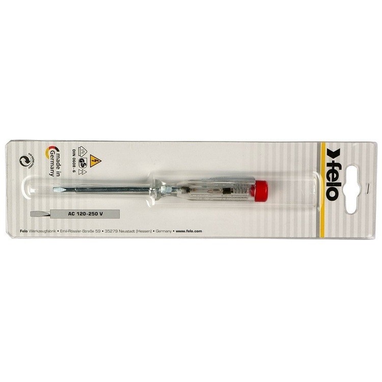 Отвертка тестер напряжения Felo SL 3,0X0,8X65 мм используется для определения фазы в электрике, а также для проверки напряжения. Изделие состоит из хром-молибден-ванадиевого стержня и пластикового корпуса, а также имеет световой индикатор. Данный тестер не требует дополнительного источника питания.