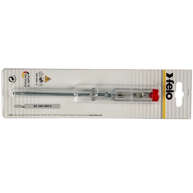 Отвертка тестер напряжения Felo SL 3,5X1X100 мм используется для определения фазы в электрике, а также для проверки напряжения. Изделие состоит из хром-молибден-ванадиевого стержня и пластикового корпуса, а также имеет световой индикатор. Данный тестер не требует дополнительного источника питания.