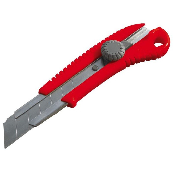 Лезвие изготовлено из качественной инструментальной стали, что обеспечивает долгий срок эксплуатации. Его ширина составляет 25 мм. Нож оснащен винтовым фиксатором, который позволяет выдвигать лезвие на необходимую длину. Эргономичный корпус выполнен из ударопрочного пластика и усилен стальной направляющей.