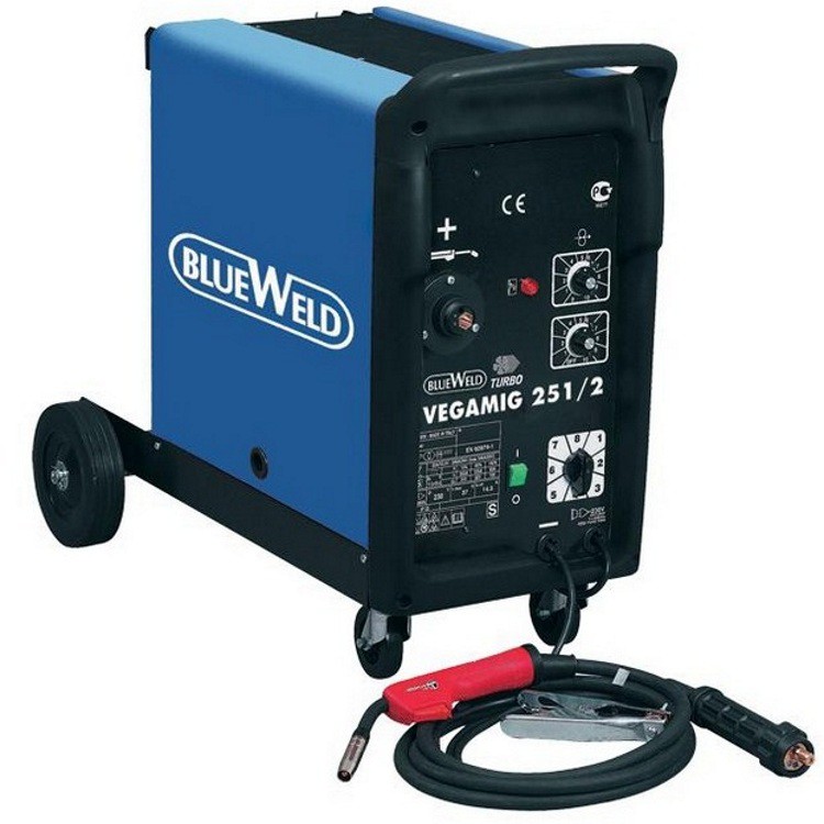 Blue Weld Vegamig 251/2 - однофазный полуавтомат, предназначенный для сварки электродной проволокой методом MIG-MAG с максимальным током 240 А. Это очень мощный аппарат – максимальная его мощность составляет 7700 Вт. Полуавтомат дает возможность производить как непрерывную, так и точечную сварку.