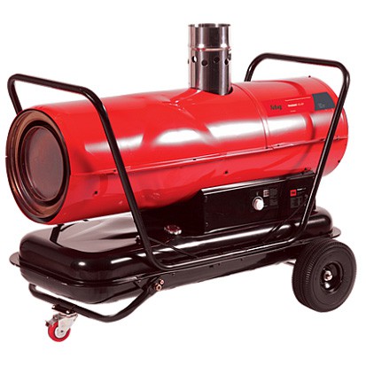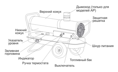 Дизельные тепловые пушки имеют особую конструкцию, состоящую из камеры сгорания, горелки, вентилятора и топливного бака. Из-за достаточно большого веса такие модели оборудованы колесным приводом и ручным управлением для удобства перемещения.