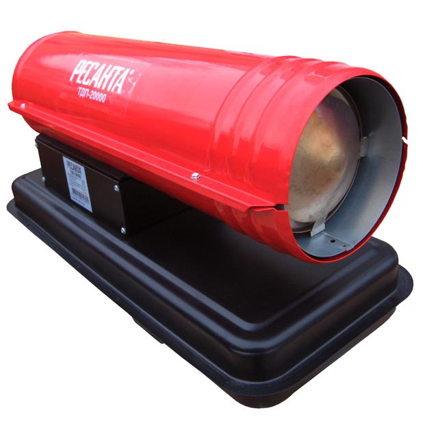 Тепловая пушка Ресанта ТДП-20000 представляет собой мощное профессиональное устройство с высокой производительностью и КПД близким к 100% и предназначена для быстрого и эффективного обогрева больших помещений. ТДП-20000 работает на дизельном топливе. Поскольку модель относится к пушкам прямого нагрева, у которых продукты сгорания дизельного топлива выводятся совместно с нагретым воздухом в помещение, ее нельзя использовать в помещениях, где находятся люди. Зато благодаря большой мощности и производительности данное устройство прекрасно подойдет для обогрева больших нежилых помещений с системой вентиляции воздуха. Это могут быть строительные площадки, склады, теплицы, производственные цеха, гаражи, да и другие помещения, где необходимо поддерживать определенную температуру и при этом помещение является хорошо вентилируемым.