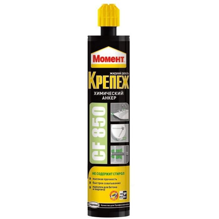 Химический анкер на основе полиэфирной смолы Момент Крепеж CF 850 представляет собой двухкомпонентный клеящий состав, предназначенный для крепежа тяжелых конструкций на поверхностях из пустотелого кирпича, бетона и других строительных материалов. Пригодность продукта для использования в строительстве подтверждается техническим свидетельством Министерства регионального развития РФ.