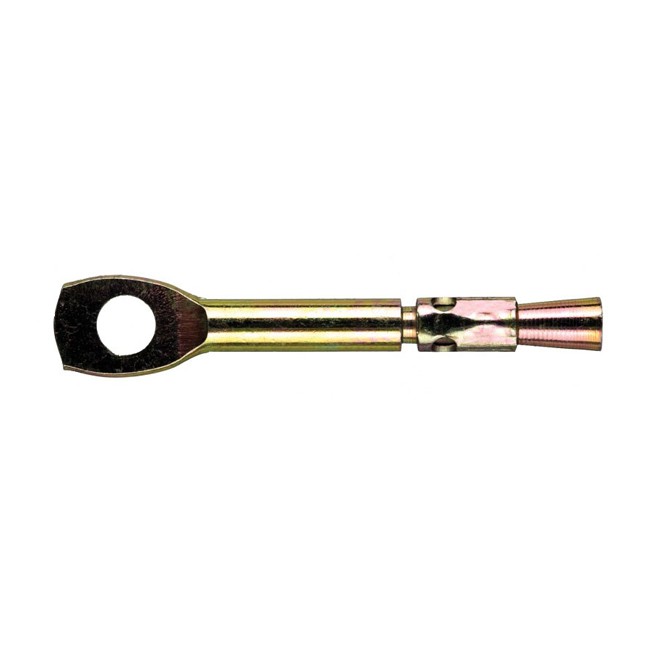 Потолочный анкер клиновой с ушком 6*60 мм представляет собой стержень, на одном конце которого имеется конусный элемент, а на другом конце плоский элемент с отверстием по центру.