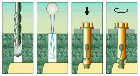 При закручивании гайки происходит смещение шпильки с конусообразным элементом относительно втулки, вызывая ее распор, приводящий к анкеровке в материале основания. Прочность анкерного соединения прямо пропорциональна прочности материала основания.