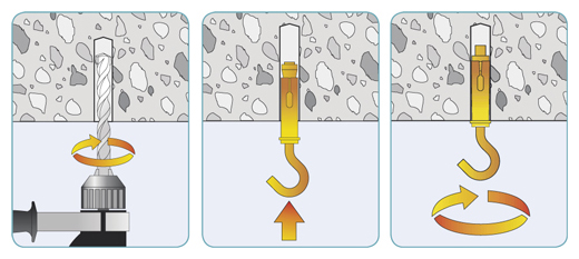 При закручивании гайки происходит смещение шпильки с конусообразным элементом относительно втулки, вызывая ее распор, приводящий к анкеровке в материале основания. Прочность анкерного соединения прямо пропорциональна прочности материала основания.