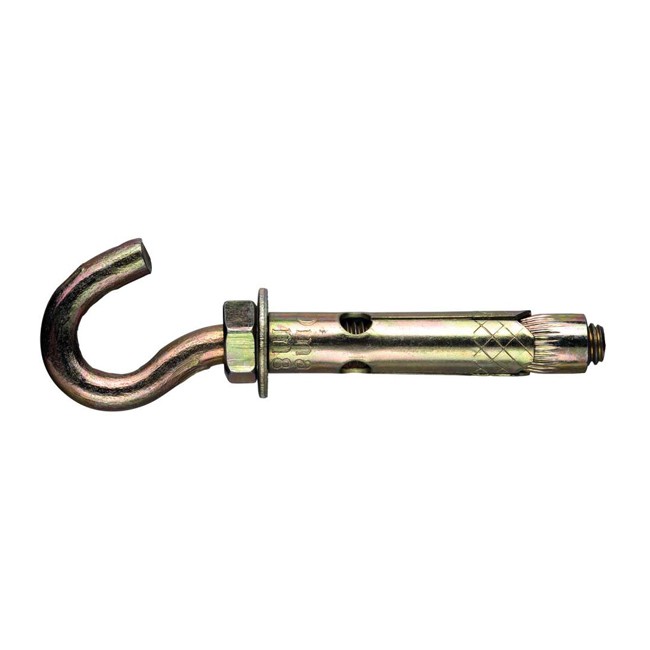 Анкерный болт 10*60 мм состоит из шпильки с метрической резьбой с полукольцом с одной стороны и конусообразным элементом с другой, цилиндрической распорной втулки, шестигранной гайки с напрессованной шайбой.