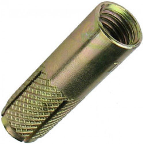 Анкер забивной - это крепежное изделие цилиндрической формы с нарезанной метрической резьбой внутри цилиндра, в которое ввинчивается соответствующая по резьбе деталь крепежа. Анкер имеет отверстие с одной стороны, а с другой расширяемую часть. Используется совместно с болтами, резьбовыми и сантехническими шпильками со стандартным шагом метрической резьбы. Стальной забиваемый анкер после производства проходит оцинковку. После монтажа анкера в основании получается точка крепления с внутренней метрической резьбой . Рекомендуемая нагрузка не должна превышать 25% от максимальной (нагрузки на вырывание). Рекомендуемая нагрузка увеличивается пропорционально возрастанию прочности бетона. При установке анкеров в бетон с трещинами необходимо нагрузки на вырывание умножить на коэффициент 0,6.