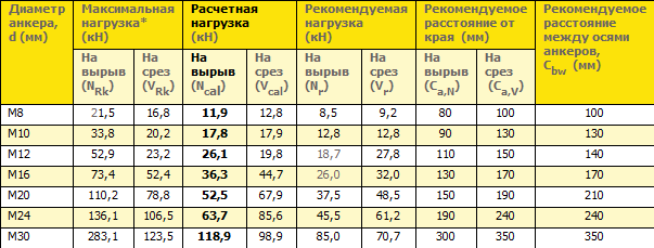 Эксплуатационные характеристики анкерных креплений при стандартной глубине заделки в основание из тяжелого бетона В20 (С20/25)
