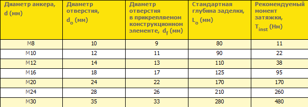Геометрические характеристики анкерных креплений при установке в основание из тяжелого бетона В20 (С20/25)