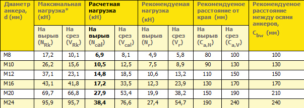 Эксплуатационные характеристики анкерных креплений при стандартной глубине заделки в основание из тяжелого бетона В20 (С20/25)