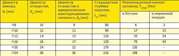 Геометрические характеристики анкерных креплений при установке в основание из тяжелого бетона В20 (С20/25)