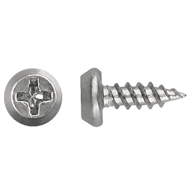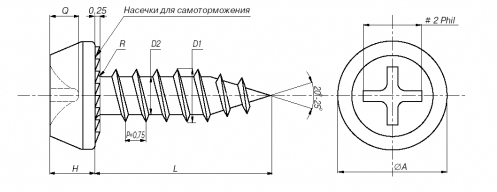 Саморез имеет полуцилиндрическую головку, острый наконечник, покрыт специальным защитным слоем. Используют изделия без предварительной подготовки отверстий. Под головкой крепежного элемента выполнены специальные насечки, препятствующие самопроизвольному отвинчиванию.