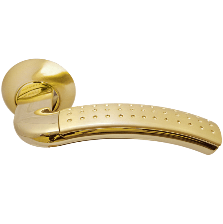 Ручка дверная Morelli Палаццо MH-02P SG/GP матовое золото/золото - на круглой розетке, поставляется в комплекте со стягивающими винтами, которые существенно увеличивают срок безотказной и безопасной эксплуатации. Соответствуют европейскому сертификату качества.