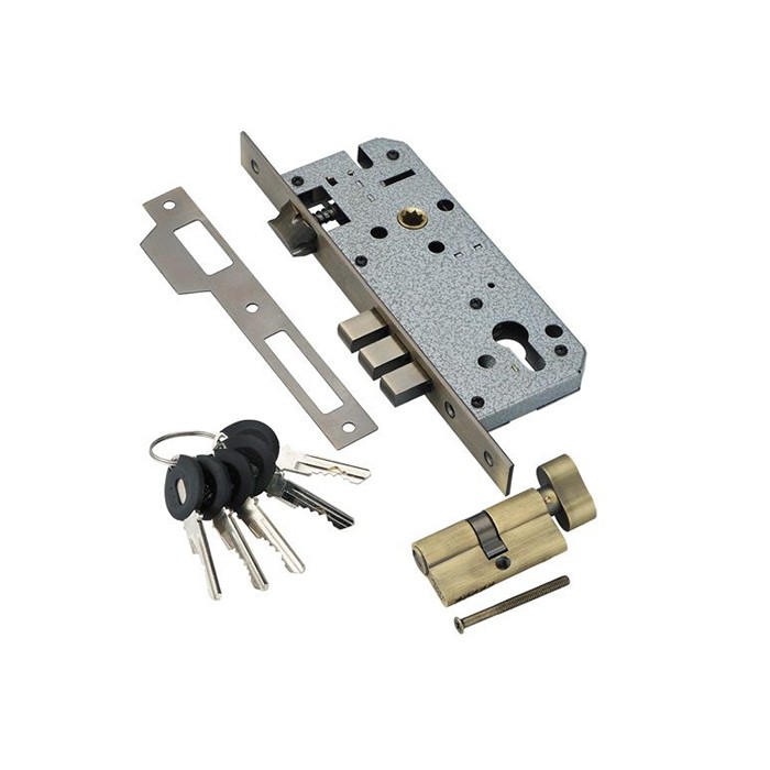 Замок врезной Adden Bau Lock 4585 5-60B D бронза с секретным двухрядным цилиндром в комплекте варианта ключ-вертушка комплектуется 5 перфорированными ключами. Изделие выполнено с металлическим язычком и 3 ригелями. Врезной замок изготовлен из стали и покрыт гальваникой, за счет чего надолго сохраняет свой внешний вид. Предназначен для установки в межкомнатные и входные двери