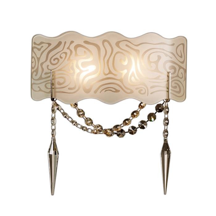 Хрустальные подвески, мягкие линии рисунка плафона, теплые оттенки цветов модели 2243/2W – это ли не секрет ее популярности? Белое матовое стекло создает дополнительный уют. Для освещения небольшого участка гостиной комнаты кв.м. в стилях барокко, подойдет бра пастельных тонов со сложными элементами конструкции.