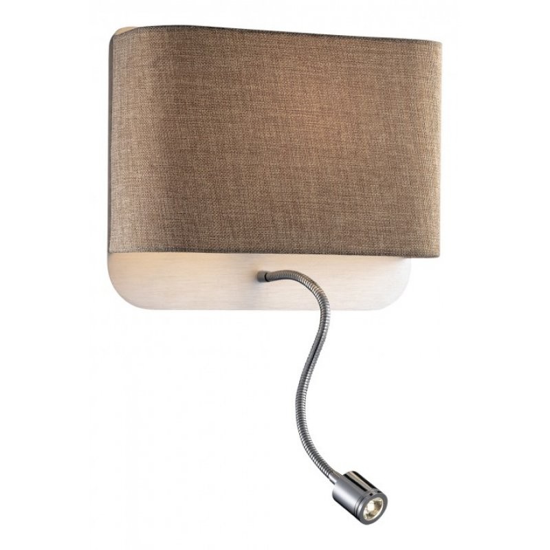 Бра замысловатой формы коллекции Bostri с двумя лампами: накаливания 60Ватт и светодиодной 1Вт, с красивым тканевым плафоном "рогожка" приятного бежевого цвета на металлической арматуре.