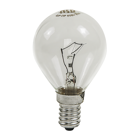 Лампа накаливания вольфрамовая ASD P45 Е14 60 Вт прозрачная предназначена для светильников внутреннего и наружного освещения в сетях переменного тока напряжением 230В, частотой 50Гц. Используется для осветительных приборов, имеющих патрон Е14.