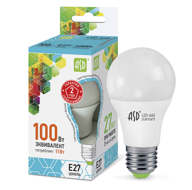Лампа светодиодная ASD Standard A60 11W Е27 4000К выполнена в классической форме груши. Рекомендуются для замены обычных ламп накаливания в светильниках с патроном Е27 и позволяют использовать лучшие преимущества светодиодов: высокое значение энергоэффективности, направленность, высокое значение CRI и долговечность, малая степень нагрева и высокая травмобезопасность (полностью отсутствует стекло в конструкции ламп).