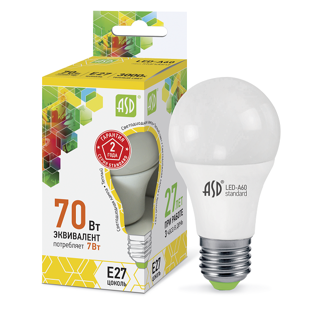 Лампа светодиодная ASD Standard A60 7W Е27 3000К выполнена в классической форме груши. Рекомендуются для замены обычных ламп накаливания в светильниках с патроном Е27 и позволяют использовать лучшие преимущества светодиодов: высокое значение энергоэффективности, направленность, высокое значение CRI и долговечность, малая степень нагрева и высокая травмобезопасность (полностью отсутствует стекло в конструкции ламп).