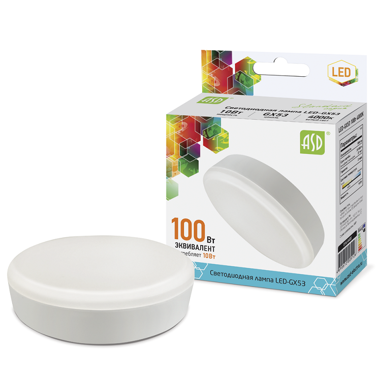 Лампа светодиодная ASD Standard GX53 10W 4000К выполнена в форме таблетки. Предназначена для замены энергосберегающих люминесцентных ламп GX с цоколем GX 53 и позволяет использовать лучшие преимущества светодиодов: высокое значение энергоэффективности, направленность, высокое значение CRI и долговечность, малая степень нагрева и высокая травмобезопасность.