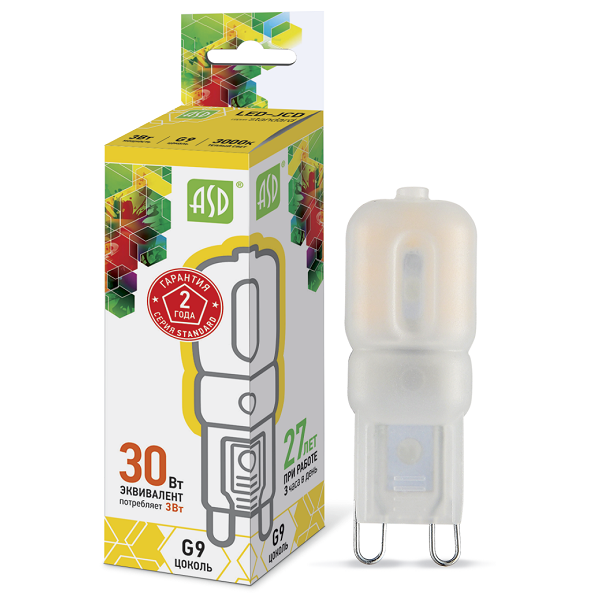 Светодиодная лампа ASD Standard JCD 3W G9 3000К – капсульная светодиодная лампа в силиконовом корпусе. Представляет собой безопасный, эффективный и экологичный источник освещения. Рекомендуется для декоративной подсветки, отличная замена галогенных капсульных ламп.