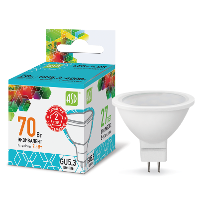 Светодиодная лампа ASD Standard JCDR 7,5W GU5.3 4000К – светодиодная лампа направленного света. Представляет собой безопасный, эффективный и экологичный источник освещения. Предназначена для замены галогенной лампы JCDR в люстрах и светильниках. Такие лампы рекомендуются для создания декоративной подсветки и подходят для большинства направленных светильников (софитов, даунлайтов) с цоколями GU5.3.