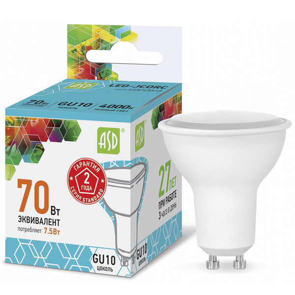Светодиодная лампа ASD Standard JCDRC 7,5W GU10 4000К – светодиодная лампа направленного света. Представляет собой безопасный, эффективный и экологичный источник освещения. Предназначена для замены галогенных ламп в люстрах и светильниках. Такие лампы рекомендуются для создания декоративной подсветки и подходят для большинства направленных светильников (софитов, даунлайтов) с цоколями GU10.