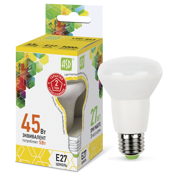 Светодиодная лампа ASD Standard R63 5W Е27 3000К – светодиодная лампа направленного света в матовой колбе рефлекторной формы. Представляет собой безопасный, эффективный и экологичный источник освещения. Предназначена для замены рефлекторных ламп накаливания. Такие лампы рекомендуются для точечной подсветки и акцентного освещения.
