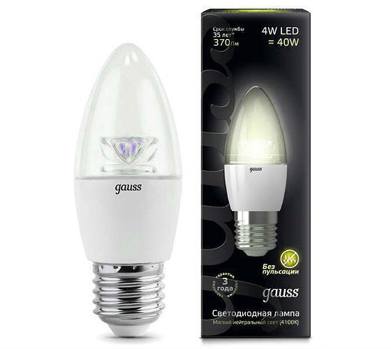 Свечеобразная светодиодная лампа Gauss на 6,5Вт дает световой поток в 610 Люмен, позволяя заменить лампы накаливания на 60Вт в потолочных и настенных светильниках с открытыми плафонами. Вытянутая форма колбы напоминает горящую свечу, открывает угол рассеивания света, бросая на стены блики при преломлении лучей в хрустальных подвесках. Идеальное решение для многоярусных люстр – светодиоды с высоким КПД светят, но не греют воздух, давая знакомый мягкий желтый свет с цветовой температурой 2700К. Работая в светильниках с цоколями Е27 лампа не требует дополнительных затрат на установку, готова служит до 35 тыс. часов при постоянном режиме работы.