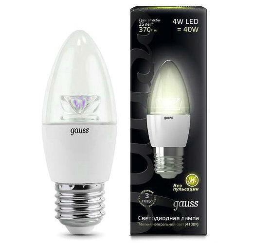 Свечеобразная светодиодная лампа Gauss 6,5W – вариант экономичного источника света для хрустальных люстр с цоколями E27. Вытянутая форма прозрачной колбы дает значительный угол рассеивания светового пучка, что образует приятные блики на стенах. Нейтральный белый свет является стабильно ярким, соответствует цветовой температуре 4100K. Светодиоды при низком потреблении энергии дают световой поток 60-ватной лампы накаливания — 630 Люмен. Радиатор из пластика и алюминия служит для быстрого охлаждения лампы, ее долгой службы без бликов. Ресурс светодиодов составляет 35 тыс. часов работы, даже при условии постоянного ежедневного включения лампа сохранит яркость.