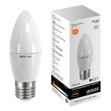 Лампа серии Gauss Elementary представляет собой доступные светодиодные технологии. Выгодная замена 60 Вт одной лампы накаливания на 6-ватную лампочку со световым потоком 540 лм, что обеспечивает высокую светоотдачу. Мягкий теплый свет в 2700К подойдет для спальни, кухни, прихожей, детской комнаты. Элегантная форма свечи украсит открытые светильники и бра, подойдет потолочным люстрам со стандартными цоколями Е27. Алюминиевый радиатор обеспечивает охлаждение лампы, при этом удешевляет ее производство. Все компоненты соответствуют европейским стандартам, потому лампа работает без миганий 25 тыс. часов.