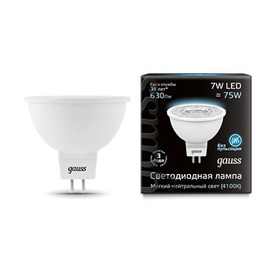 Мощность лампочки составляет 7 Вт, а мощность светового потока, который она продуцирует, аналогична световому потоку галогенной лампы мощностью 75 Вт. При этом светодиодная лампа Gauss обеспечивает более стабильный и равномерный свет без пульсации. Она также защищена от перепадов напряжения и не боится падений. Изделие обладает продолжительным сроком службы, равным 35000 часов, и позволяет снизить затраты электроэнергии до 10 раз.