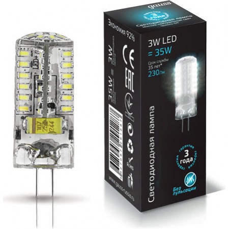 Капсульная светодиодная лампа Gauss обеспечивает экономичным освещением владельцев точечных, настенных и потолочных светильников с цоколем G4. Светодиоды, заключенные в силиконовую оболочку, снабжены алюминиевым радиатором, который продлевает срок службы до 35 тыс. часов и снижают затраты на частую замену ламп – их можно устанавливать в самых труднодоступных местах. Светодиоды выдерживают входящее напряжение 85-265В, чем избавляют от необходимости покупать блоки питания для сети на 220В. Цветовая температура 4100К поддержит нейтральный белый свет, который рассеивается на 360 градусов — в светильниках со стеклянными и хрустальными элементами поможет создать эффектные блики.