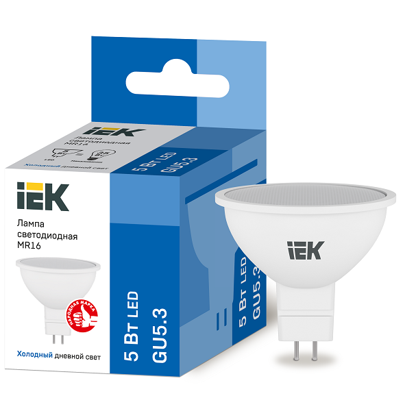Лампа светодиодная IEK Eco MR16 5 Вт GU5.3 6500К выполнена в форме отражателя (рефлектора). Такие лампы рекомендуются для замены обычных ламп накаливания и позволяют использовать лучшие преимущества светодиодов: высокое значение энергоэффективности, направленность, высокое значение CRI и долговечность, малая степень нагрева.